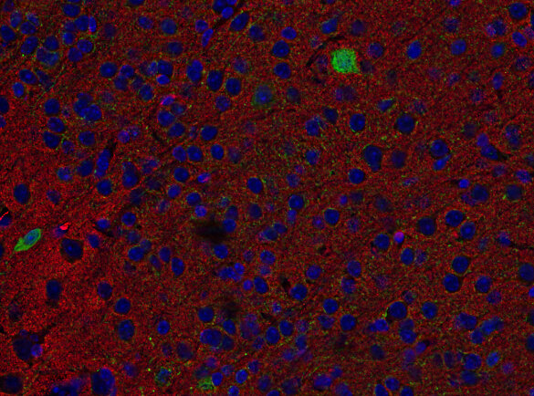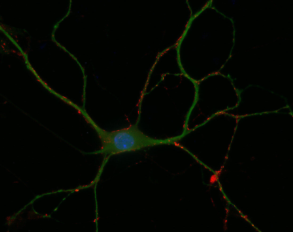 SV2s (Synaptic Vesicle Protein 2) are integral membrane glycoproteins present in synaptic vesicles. They have 12 transmembrane domains predicted by sequence analysis (1). There are three characterized isoforms, SV2 A, SV2 B and SV2 C that are similar in structure but show different expression patterns. SV2 A is expressed ubiquitously throughout the brain and plays a crucial role in modulating synaptic transmission by regulating the expression and trafficking of synaptotagmin, a key calcium sensor in neurotransmitter release (1).