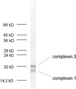 Complexins are enriched in neurons where they colocalize with syntaxin 1 and SNAP 25. In addition, complexin 2, also referred to as synaphin 1, is expressed ubiquitously at low levels. Complexins bind weakly to syntaxin 1 alone and not at all to synaptobrevin and SNAP 25, but strongly to the SNAP receptor-core complex composed of these three molecules. They compete with α-SNAP for binding to the core complex but not with other interacting molecules, suggesting that complexins regulate the sequential interactions of α-SNAP and synaptotagmins with the SNAP receptor during exocytosis.