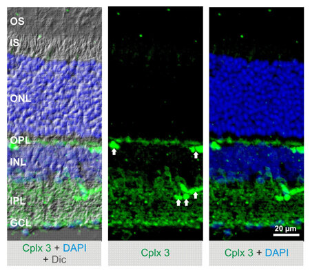 In retinal ribbon synapses complexin 3 and complexin 4 functionally replace complexin 1 and 2. They have similar biochemical binding properties and are farnesylated at their C-terminus.