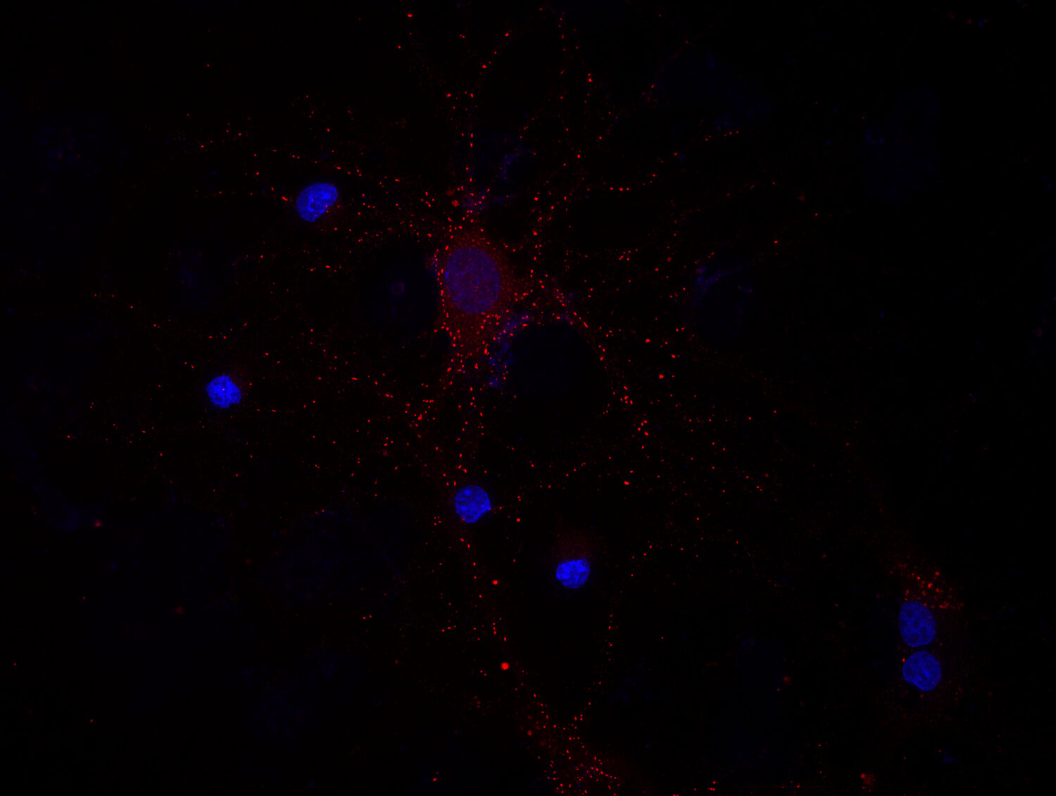 Albumin and azide were added for stabilization. For reconstitution add 100 µl H2O to get a 1mg/ml solution in PBS. Either add 1:1 (v/v) glycerol, then aliquot and store at -20°C until use, or store aliquots at -80°C without additives. Reconstitute immediately upon receipt! Avoid bright light when working with the antibody to minimize photo bleeching of the fluorescent dye. |
