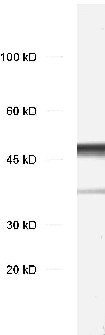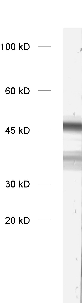 50 µg specific antibody, lyophilized. Affinity purified with the immunogen. Albumin was added for stabilization. For reconstitution add 50 µl H2O to get a 1mg/ml solution in PBS. Then aliquot and store at -20°C to -80°C until use. Antibodies should be stored at +4°C when still lyophilized. Do not freeze! |