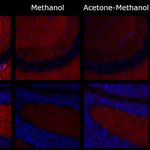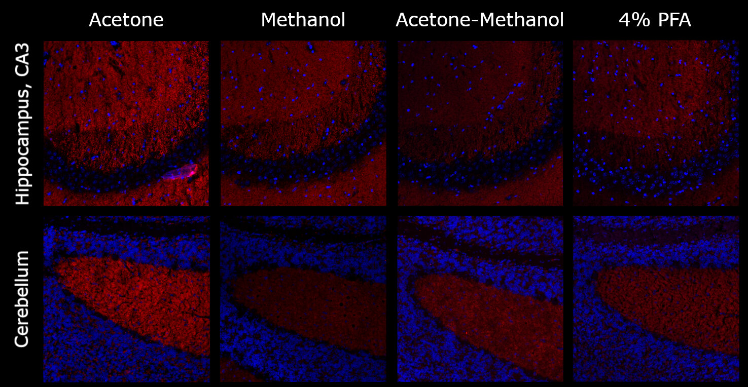 Immunohistochemistry on fresh frozen (IHC-Fr) cryo-tissue-sections. In contrast to standard PFA perfusion fixed tissues, fresh frozen cryo-tissue-sections can be variably postfixed with alcohols, acetone or PFA. Alcohol or acetone fixation is e.g. of advantage for antigens masked by PFA crosslinking. For recommended postfixation, please refer to the ”Remarks” section. Immunoreactivity is usually revealed by fluorescence or a chromogenic substrate.