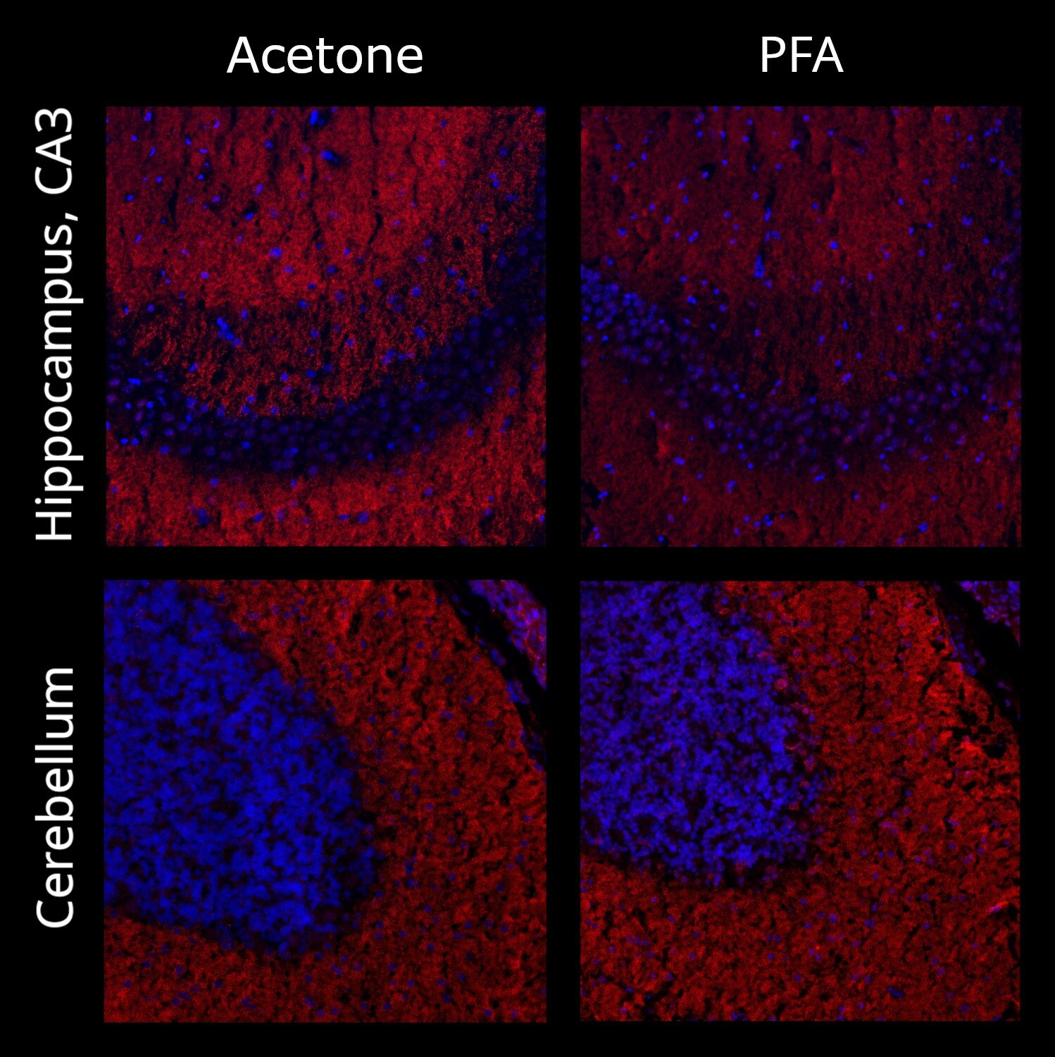 IHC: This antibody has been successfully applied for this method by our customers using mild fixation (4% PFA and 15% picric acid) according to Kirizs et al. 2014 (see gallery). It has not been validated using our standard protocol. |
