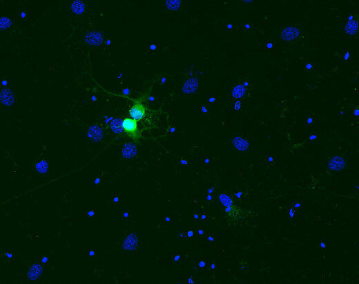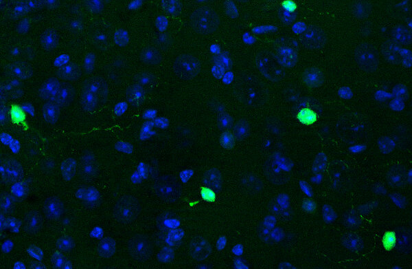 Albumin was added for stabilization. For reconstitution add 100 µl H2O to get a 1mg/ml solution in PBS. Either add 1:1 (v/v) glycerol, then aliquot and store at -20°C until use, or store aliquots at -80°C without additives. Reconstitute immediately upon receipt! Avoid bright light when working with the antibody to minimize photo bleeching of the fluorescent dye. |