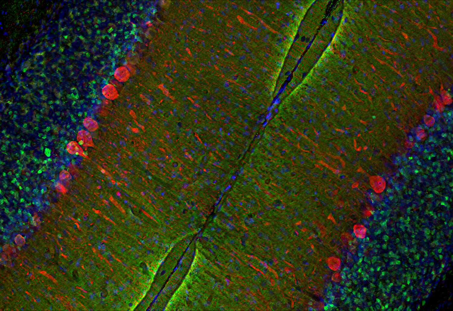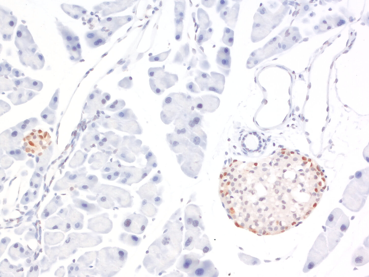 Calbindin D28k (CALB1, D28K or CAB27) and Calretinin (Calbindin D29k) are members of the EF-hand calcium-binding protein family, playing essential roles in intracellular calcium homeostasis, neuroprotection, and signal transduction (1). Calbindin D28k is widely expressed in tissues that experience high calcium influx, such as the brain, sensory organs, endocrine tissues, and the enteric nervous system (ENS). In the central nervous system (CNS), Calbindin D28k is an important marker for specific neuronal populations, particularly in Purkinje cells of the cerebellum and GABAergic and glutamatergic neurons of the cortex (2). Outside the CNS, Calbindin D28k plays crucial roles in non-neuronal tissues. In the retina, it contributes to photoreceptor function and calcium signaling (3). In the pancreas, it is present in α- and β-cells (4). Additionally, it was reported that 31% of myenteric neurons and up to 95% of submucosal neurons in the human ENS express calbindin, suggesting its involvement in both motor and secretory functions (5).