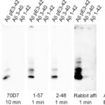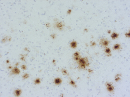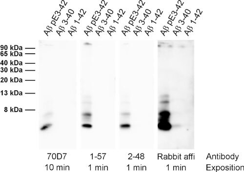 Detects purified Abeta pE3. Complex samples like brain extracts still have to be tested. Boil membrane in PBS after blotting for 3min.
