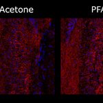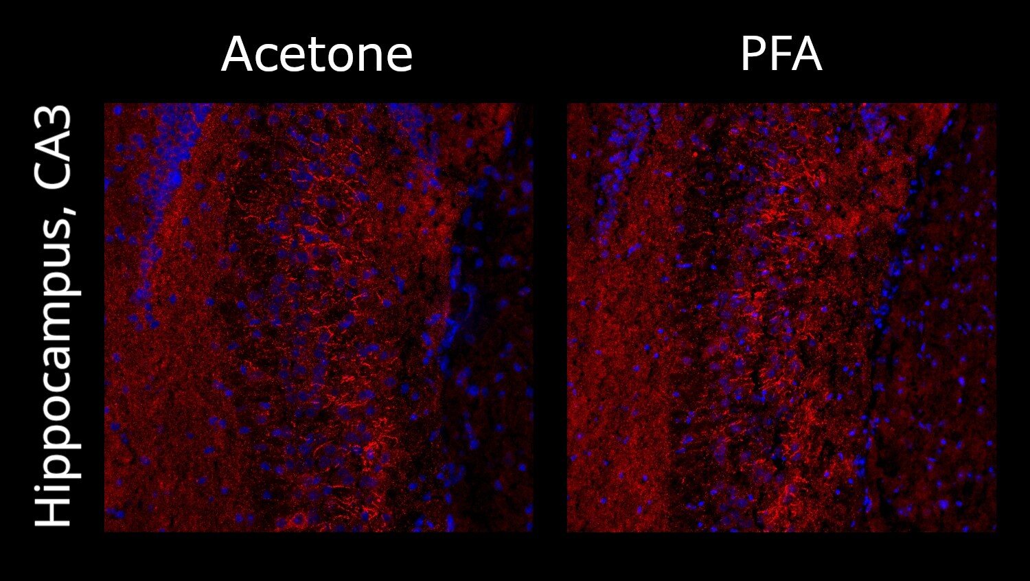 Immunohistochemistry on fresh frozen (IHC-Fr) cryo-tissue-sections. In contrast to standard PFA perfusion fixed tissues, fresh frozen cryo-tissue-sections can be variably postfixed with alcohols, acetone or PFA. Alcohol or acetone fixation is e.g. of advantage for antigens masked by PFA crosslinking. For recommended postfixation, please refer to the ”Remarks” section. Immunoreactivity is usually revealed by fluorescence or a chromogenic substrate.