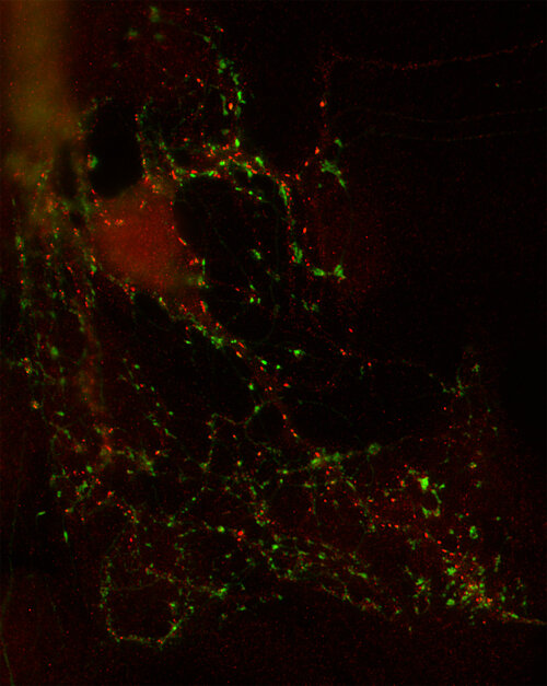 Electron microscopy (EM) is a microscopy technique that detects the scatter of electrons through thin tissue sections. In Immuno-EM the antigen is usually revealed by colloidal gold conjugated secondary antibodies linking electron dense structures to antigen-bound primary antibodies.
