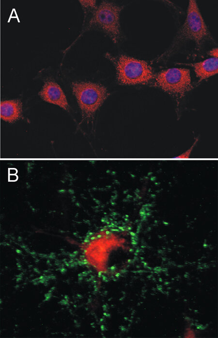 Immunocytochemistry (ICC) on 4% PFA fixed cells. Immunoreactivity is usually revealed by fluorescence. Some antibodies require special fixation methods. For details, please refer to the “Remarks” section.