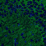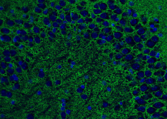 Five EAATs with differential expression patterns have been described so far: EAAT1, also referred to as GLAST and SLC1A3, has neuroprotective potential following ischemia and occurs in reactive astrocytes and activated microglia. EAAT2 (GLT-1, SLC1A2) is the most abundant isoform and is primarily expressed in astrocytes. Both variants show high levels in brain and retina. EAAT3 / SLC1A1, EAAT4 / SLC1A6 and EAAT5 / SLC1A7 are expressed in neurons (2). EAAT4 shows weak expression in the forebrain and high levels in the cerebellum, where it mainly locates to Purkinje cells (3). EAAT5 primarily occurs in the retina, where it locates very close to glutamate release sites. In K.O. mice flicker resolution is considerably compromised (4). Recent findings suggest that EAAT5 is an abundant isoform, expressed also in non-neuronal peripheral tissues (5).