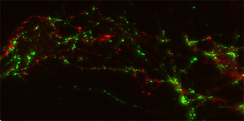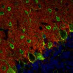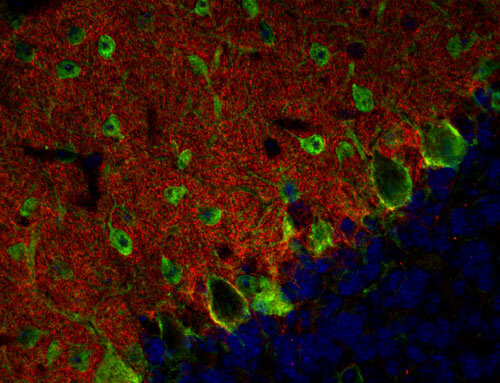 Five EAATs with differential expression patterns have been described so far: EAAT1, also referred to as GLAST and SLC1A3, has neuroprotective potential following ischemia and occurs in reactive astrocytes and activated microglia. EAAT2 (GLT-1, SLC1A2) is the most abundant isoform and is primarily expressed in astrocytes. Both variants show high levels in brain and retina. EAAT3 / SLC1A1, EAAT4 / SLC1A6 and EAAT5 / SLC1A7 are expressed in neurons (2). EAAT4 shows weak expression in the forebrain and high levels in the cerebellum, where it mainly locates to Purkinje cells (3). EAAT5 primarily occurs in the retina, where it locates very close to glutamate release sites. In K.O. mice flicker resolution is considerably compromised (4). Recent findings suggest that EAAT5 is an abundant isoform, expressed also in non-neuronal peripheral tissues (5).