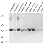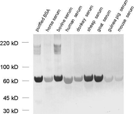Reacts with: human (P02768), rat (P02770), mouse (P07724), Guinea pig, horse, donkey, cow, sheep, goat. No signal: rabbit (P49065). Other species not tested yet. |