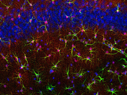 S100B is a frequently used marker protein for mature astrocytes whereas GFAP is also expressed in germinal zone cells that maintained their immature developmental stage.