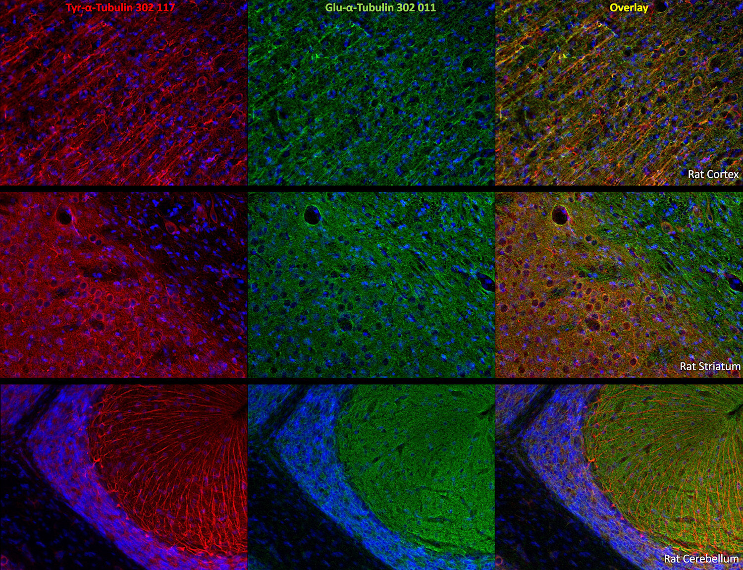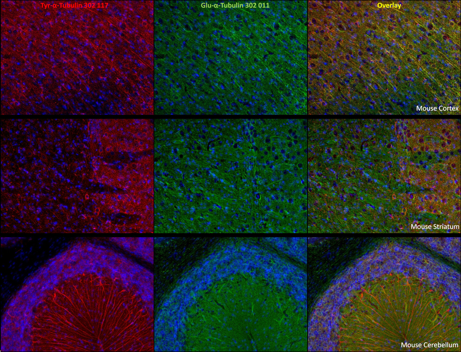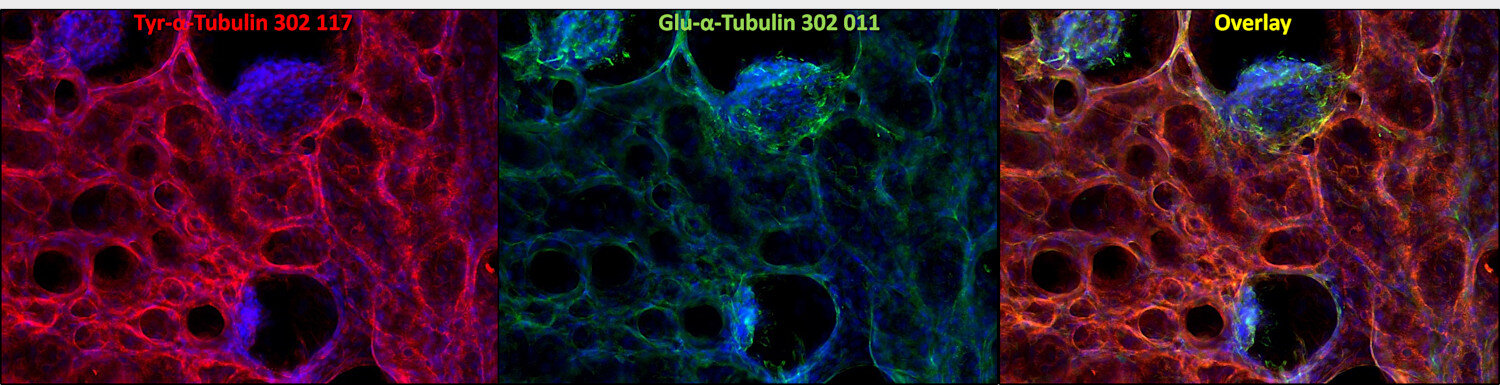 α Tubulin undergoes numerous post-translational modifications that include tyrosination-detyrosination and deglutamylation, phosphorylation, acetylation, polyglutamylation, and polyglycylation. In one of the major posttranslational modifications, the C-terminal tyrosine residue in α-tubulin is added or removed reversibly, producing Glu-tubulin (after detyrosination) and Tyr-tubulin (with re-added tyrosine). Early stages of cell development are often enriched in Tyr tubulin, whereas mature cells show increased Glu tubulin in stable structures. Some microtubule associated proteins (MAPs), motor proteins like kinesins, or stabilizing factors have different affinities for Glu- or Tyr-tubulin (2,3,4).