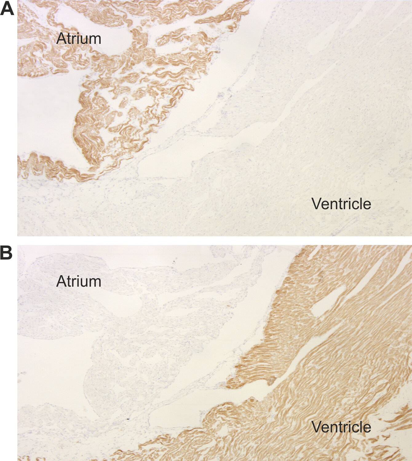 These antibodies are useful tools to distinguish between ventricle and atrium specific cardiomyocytes.