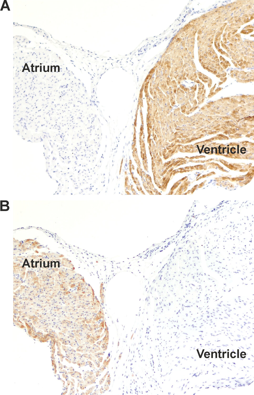 These antibodies are useful tools to distinguish between ventricle and atrium specific cardiomyocytes.