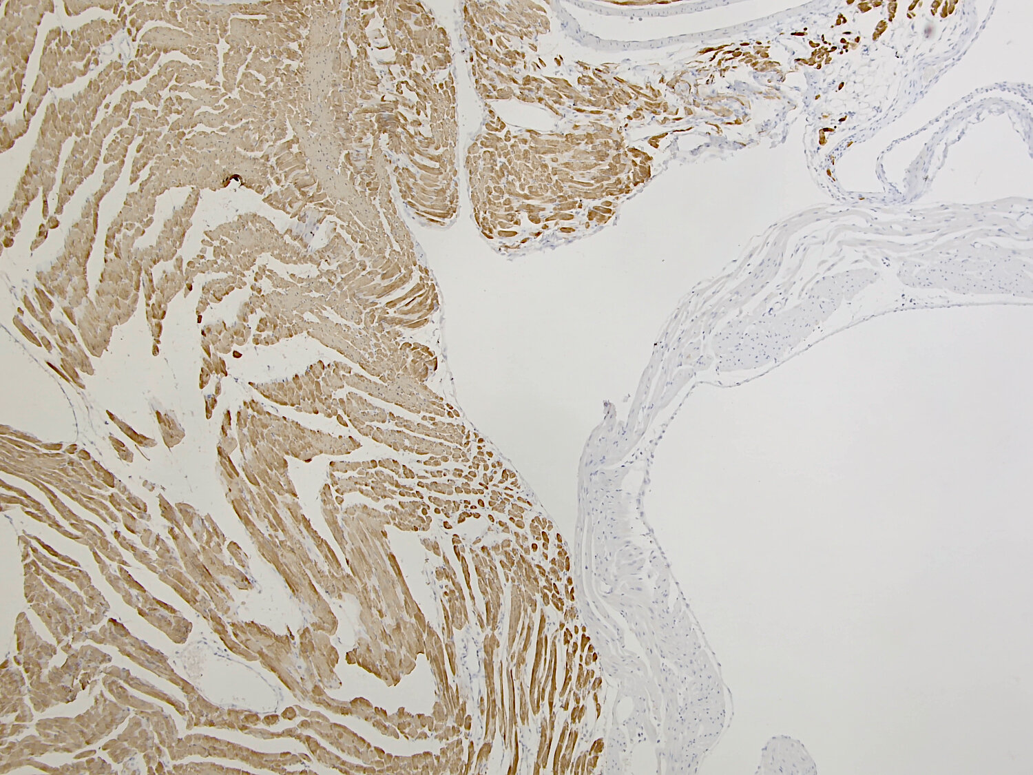 During cardiogenesis two major isoforms of myosin light chain 2 are co-expressed in a tightly regulated manner. MLC-2V is only present in the ventricle while MLC-2A is exclusively expressed in the atrium. Knock out studies revealed that the 2A isoform cannot substitute for the 2V variant in the ventricular chamber.