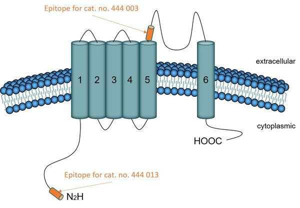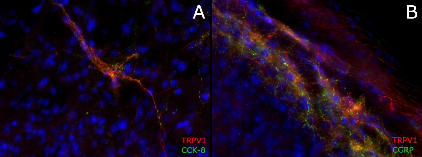 TRPV1 (Transient receptor potential cation channel subfamily V member 1, also capsaicin receptor and vanilloid receptor 1) is a member of the TRPV group of the transient receptor potential family of ion channels (1, 3). Expression has been mainly reported in sensory neurons of the peripheral and central nervous system (2, 3). The receptor is activated by a wide variety of exogenous and endogenous physical and chemical stimuli like temperature greater than 42°C; acidic conditions (pH<6); vanilloids, like capsaicin, and allyl isothiocyanate (3). In addition to direct activation, TRPV1 channel activity can also be modulated by inflammatory mediators, such as prostaglandins and bradykinin (4). TRPV1 is involved in the detection and regulation of body temperature, as well as in the sensation of noxious environmental stimuli, like scalding heat and pain. TRPV1 acts as ionotropic endocannabinoid receptor with central neuromodulatory effects and is a prime target for the development of analgesics (5).