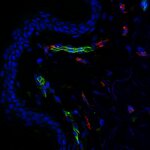 CD31 or platelet/endothelial cell adhesion molecule-1 (PECAM-1) is a cell adhesion molecule that contains a single trans-membrane domain and 6 Ig-like C2-type (immunoglobulin-like) domains (1). It is expressed on the surface of leukocytes and platelets and is primarily concentrated at endothelial cell-cell junctions (2). CD31 plays a role in several important biological processes, such as vascular development, maintenance of vascular endothelial barrier function and leukocyte emigration at inflammatory sites. In addition, CD31 promotes cancer metastasis by inducing epithelial-mesenchymal transition (3).