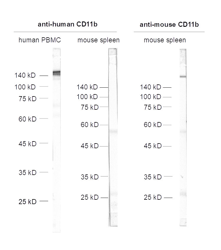 CD11b also called integrin alpha-M (ITGAM) is one protein subunit that forms together with CD18 the heterodimeric integrin αMβ2 complex, also known as macrophage-1 antigen (Mac-1) or complement receptor 3 (CR3) (1). αMβ2 is expressed on polymorphonuclear neutrophils (PMN), monocytes, macrophages, some subsets of cytotoxic T lymphocytes, and NK cells. Antibodies against CD11b are frequently used to identify macrophages and microglia, however not all tissue-resident macrophages are CD11b positive. In the murine liver CD11b expression is rare and almost exclusively found on F4/80 negative cells (2). In the murine spleen CD11b+ cells are less numerous than F4/80+ cells, co-expression of CD11b and F4/80 is also rare and CD11b+ cells tend to be closer to the marginal zone (2). CD11b upregulation on residential alveolar macrophages is a marker of acute and chronic lung inflammation in mice (3). Also, in the brain CD11b is markedly increased during microglial activation (4).