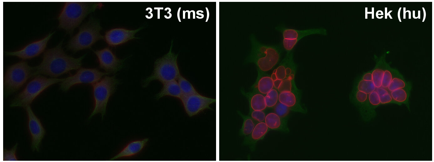 Immunocytochemistry (ICC) on 4% PFA fixed cells. Immunoreactivity is usually revealed by fluorescence. Some antibodies require special fixation methods. For details, please refer to the “Remarks” section.