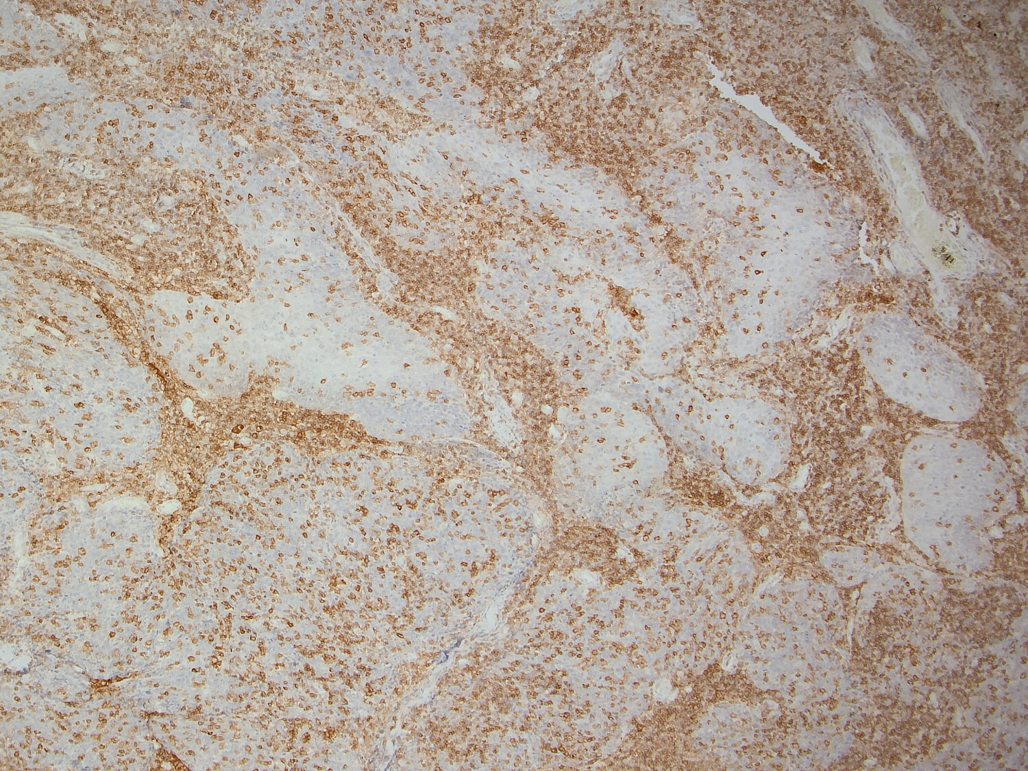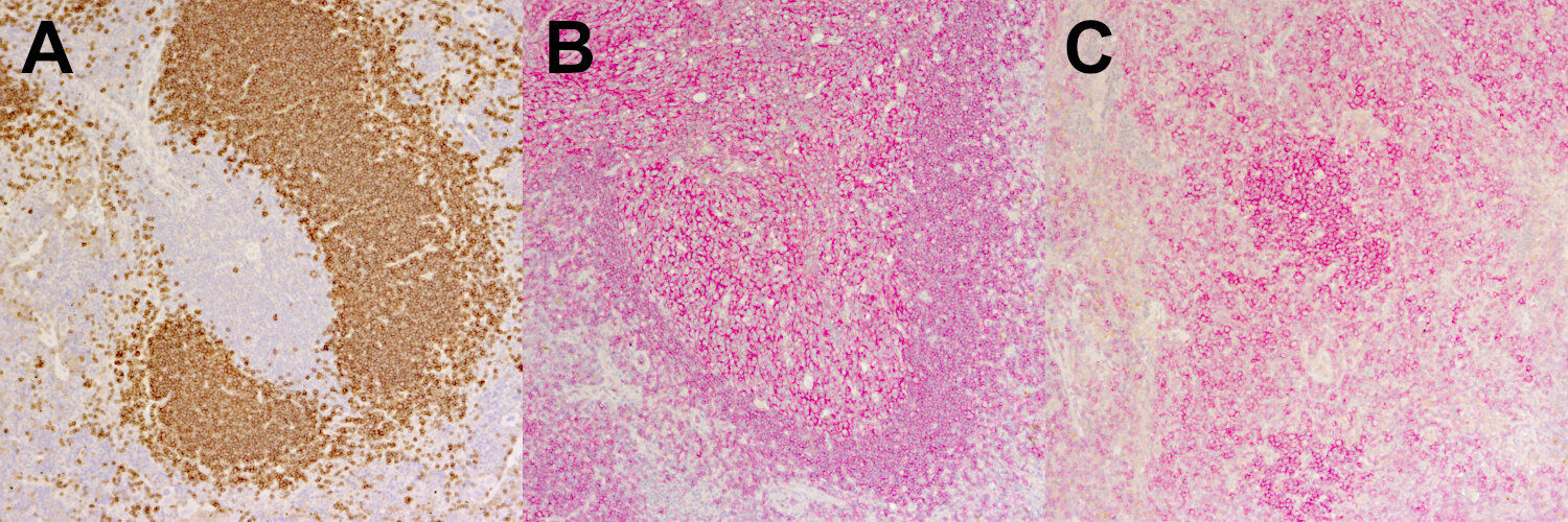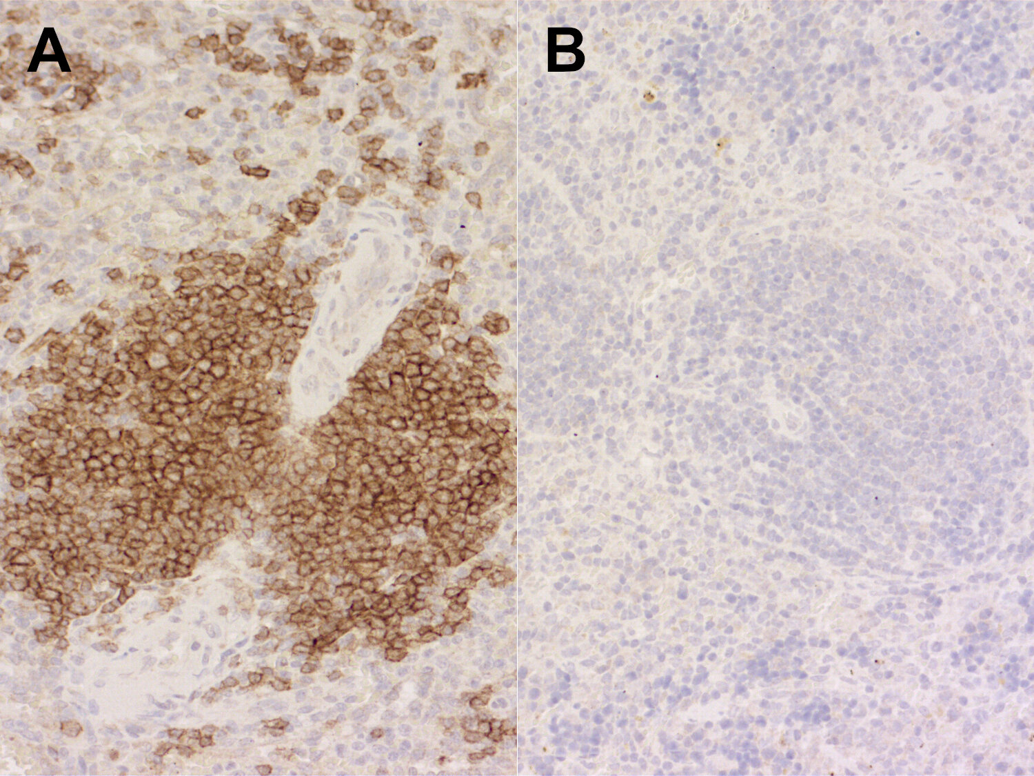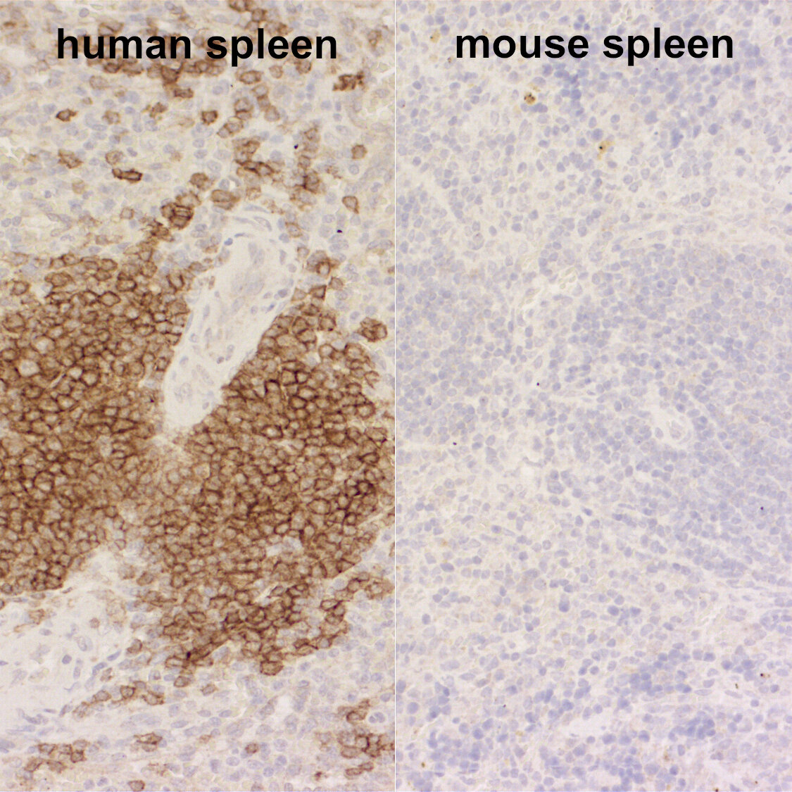 Immunohistochemical staining of B-cells in human spleen (left) but not in mouse spleen (right) using a human-specific anti-CD19 antibody.