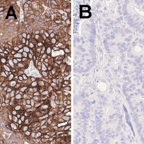 Cytokeratins are cytoskeleton proteins of epithelial tissues, contributing to the mechanical stabilization of the cells. The cytokeratin family consists of at least 20 isotypes, which are largely specific for particular organs or tissue types. Therefore, immunohistochemical staining of cytokeratins is clinically used for diagnosis of carcinomas, in particular of unclear metastases and in precise classification and subtyping of tumors (1). Cytokeratin 7 (CK7) is expressed in healthy bladder, in the female genital tract epithelium, in mesothelium and in the lung (2). In tumors, CK7 expression is found in the majority of carcinoma types, with the exception of those carcinomas arising from the colon, prostate, kidney and thymus (3). Furthermore, CK7 expression can have prognostic relevance, e.g. adverse prognostic factor in lung cancer (4), or predictive relevance, e.g. predictive factor of response to concurrent radiochemotherapy in advanced cervical cancer (5).