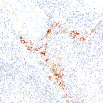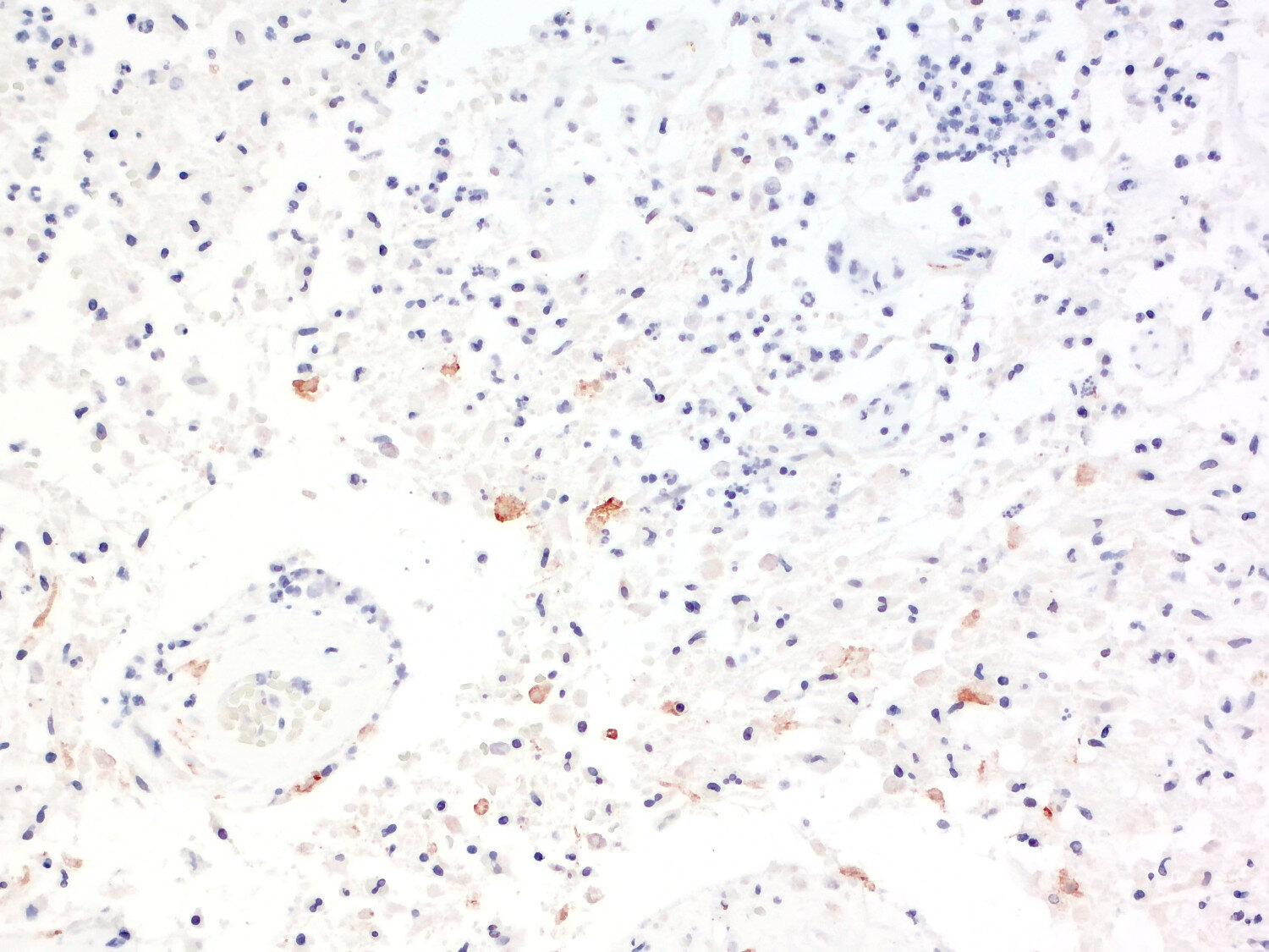 CD169, also known as Siglec-1 or sialoadhesin, is a cell surface receptor that is most frequently expressed by certain macrophage subsets in lymphoid tissue: the marginal metallophilic macrophages (MMMs) of the spleen and the macrophages in the subcapsular sinus and medulla of lymph nodes (1). To a lesser extent, CD169 is also found on macrophages in liver, lung and colon. CD169⁺ macrophages are involved in immunological tolerance, antigen presentation and defense against infectious agents such as viruses (2) and play a tumor-suppressive role in malignant tumors (3). In the intact brain, CD169 stains subpopulations of macrophages in the choroid plexus, leptomeninges and circumventricular organs (4). CD169 is regulated by contact with plasma proteins, and damage to the blood-brain barrier leads to the expression of CD169 on microglia and macrophages within the parenchyma (4). In glioblastoma, CD169⁺ tumor-associated macrophages were shown to exert an important anti-tumor role by promoting the phagocytosis of apoptotic tumor cells, enhancing the activation of tumor-specific T cells, and supporting lymphocyte infiltration into the tumor microenvironment (5).