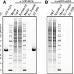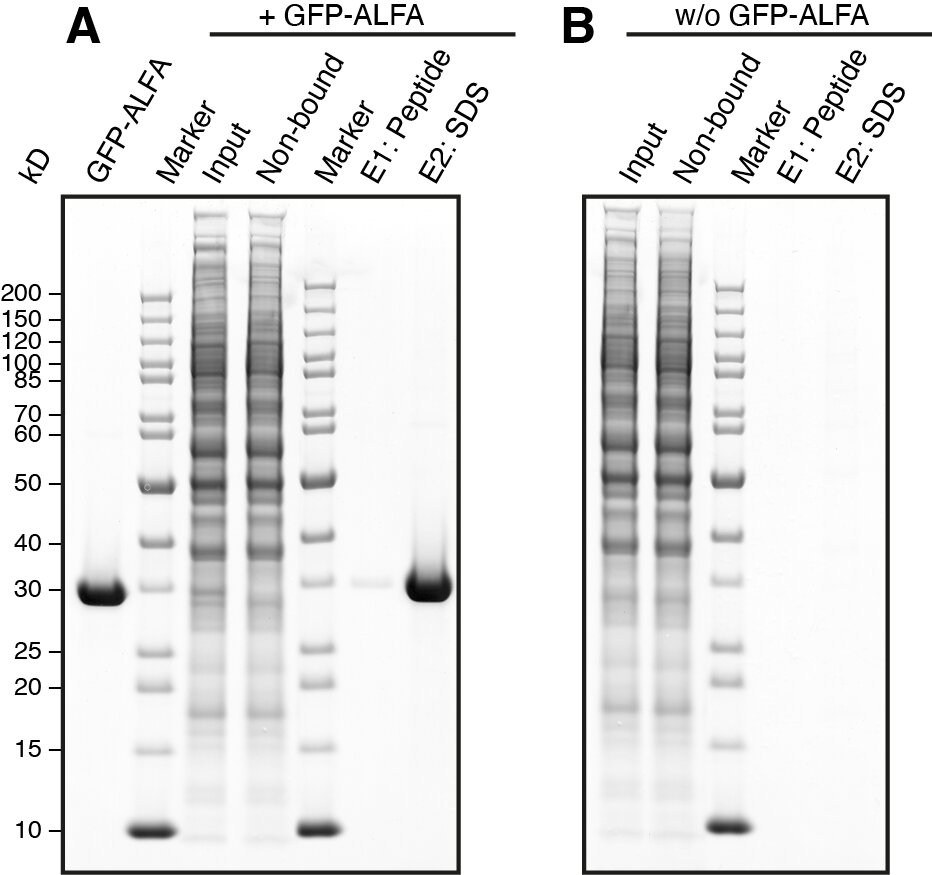 For immunoprecipitations we offer two types of ALFA Selector resins, tailor-made for specific requirements and applications. All ALFA Selectors are based on ALFA-tag specific nanobodies covalently immobilized on 4% cross-linked agarose or magnetic agarose beads. ALFA Selector ST (for Super-Tight) offers the highest possible affinity for ALFA-tagged targets, which can be eluted under acidic or denaturing conditions. ALFA Selector PE (for Peptide Elution) displays an engineered nanobody with lower affinity (Kd ~11 nM), which is optimized for peptide elution under physiological conditions. ALFA Selector CE (for Cold Elutable) carries an engineered nanobody with lower affinity (Kd 100 nM), which is optimized for peptide elution under physiological conditions at low temperature (4°C). All Selector resins feature low non-specific protein adsorption and therefore allowing clean and meaningful immunoprecipitations. Due to the covalent and oriented immobilization, the immobilized nanobodies will stay on the resin even when using harsh denaturing and/or reducing conditions for elution. In contrast to conventional immunoprecipitations, eluates from both ALFA Selectors will therefore be free from large amounts of antibody fragments.